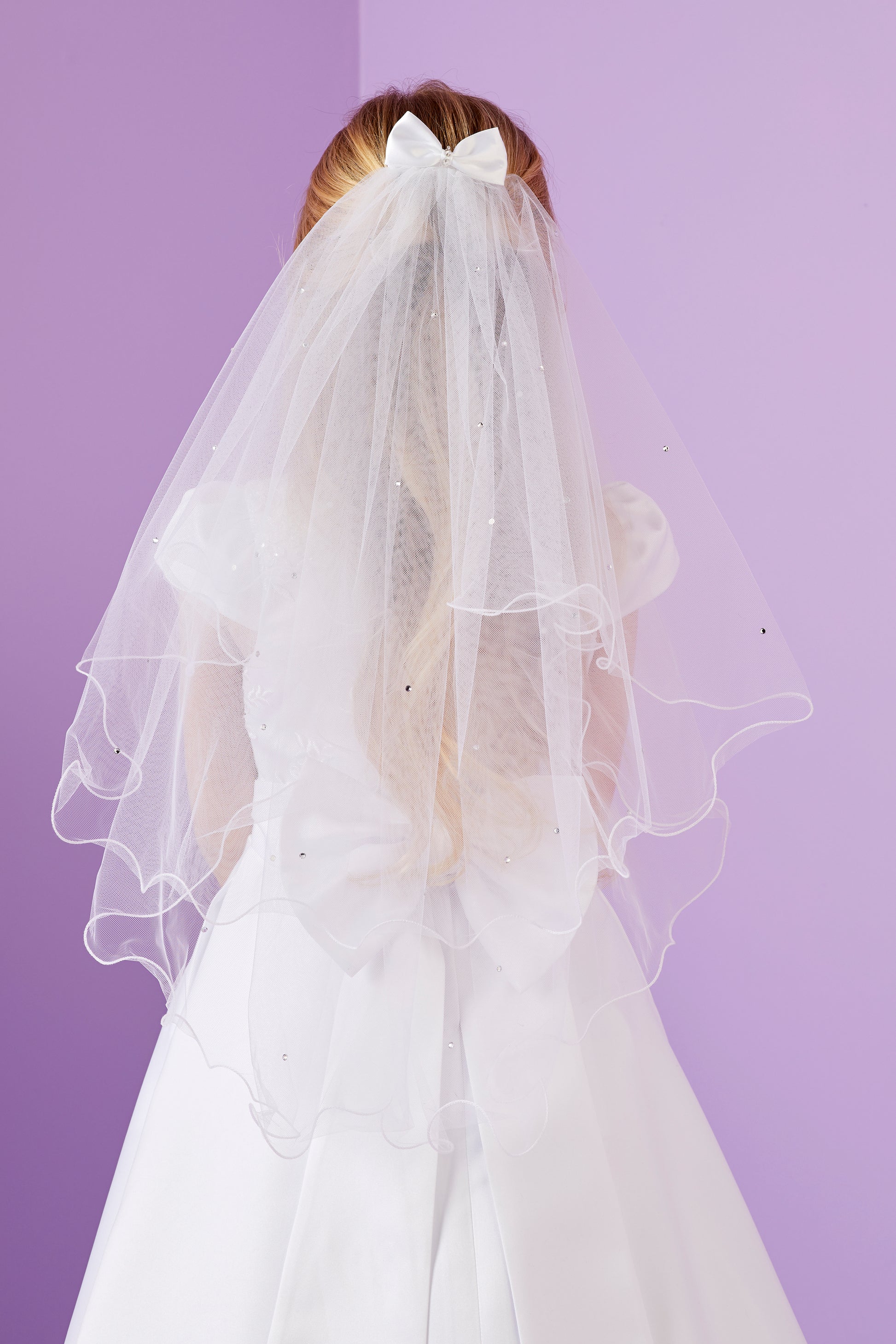 Etta is an ankle length Holy Communion dress. This practically perfect Communion dress is simple yet classically elegant. The lace embroidered bodice has gathered lace cap sleeves and a diamante embellished waistband. A flared organza overlay to the duchess satin skirt with an embroidered lace hem completes the look. To finish the pre tied bow at the back means it looks perfect all of the time.