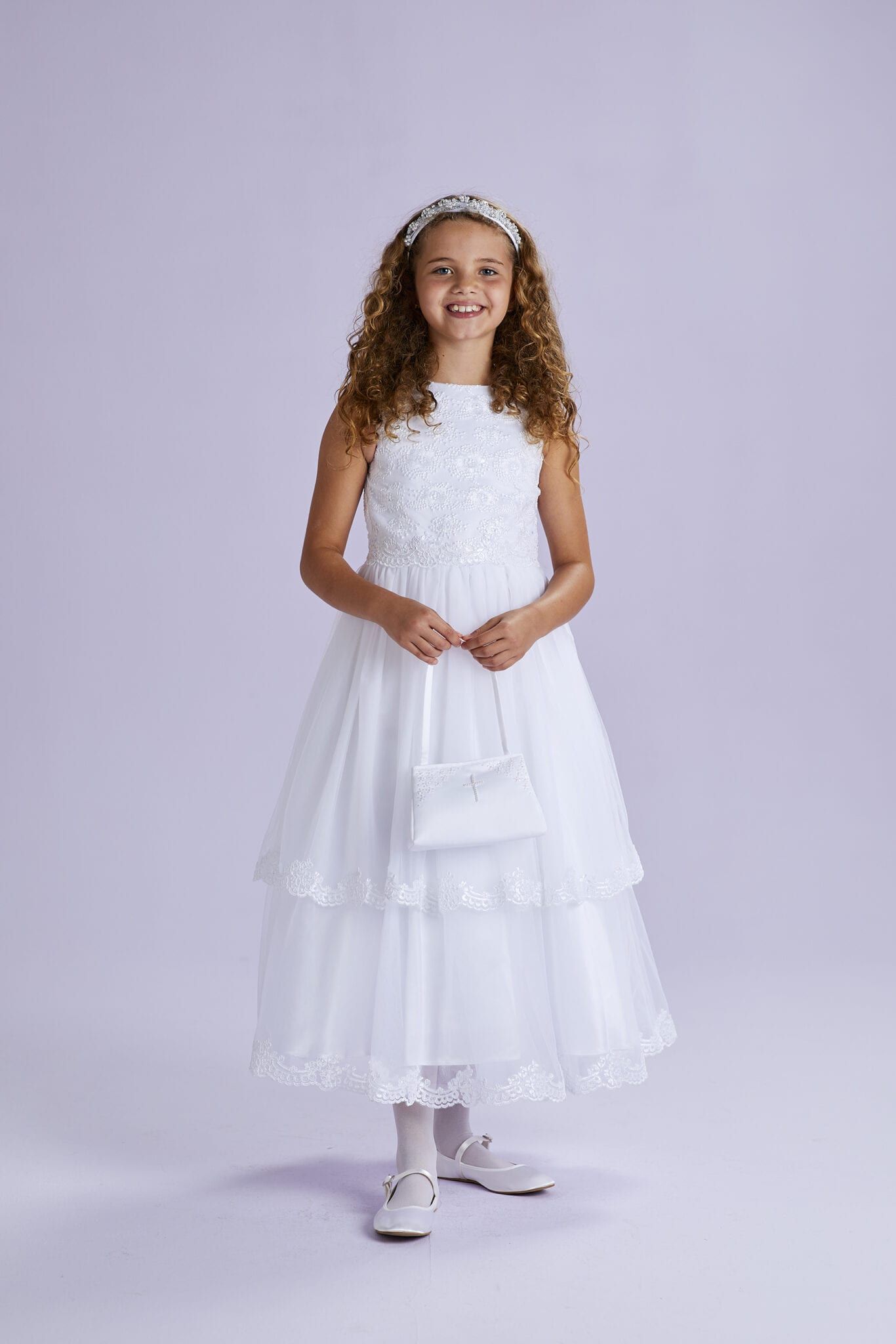 Helene is an ankle length White Holy Communion dress. The sleeveless bodice is covered in sequined embroidered lace finished with a scalloped edge over the waistline. Meanwhile the two tiered full net skirt is edged with matching lace to the bodice. A perfect dress for twirling in.