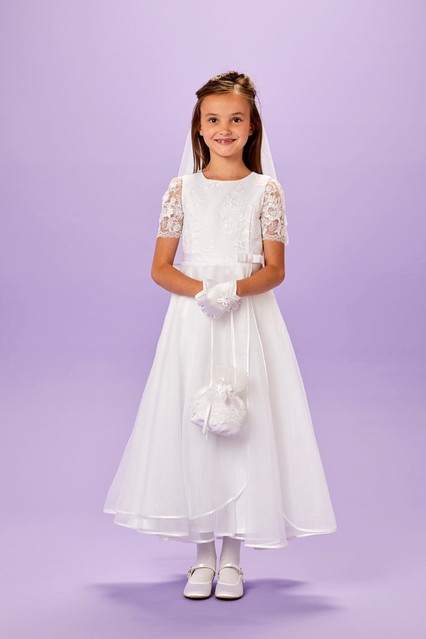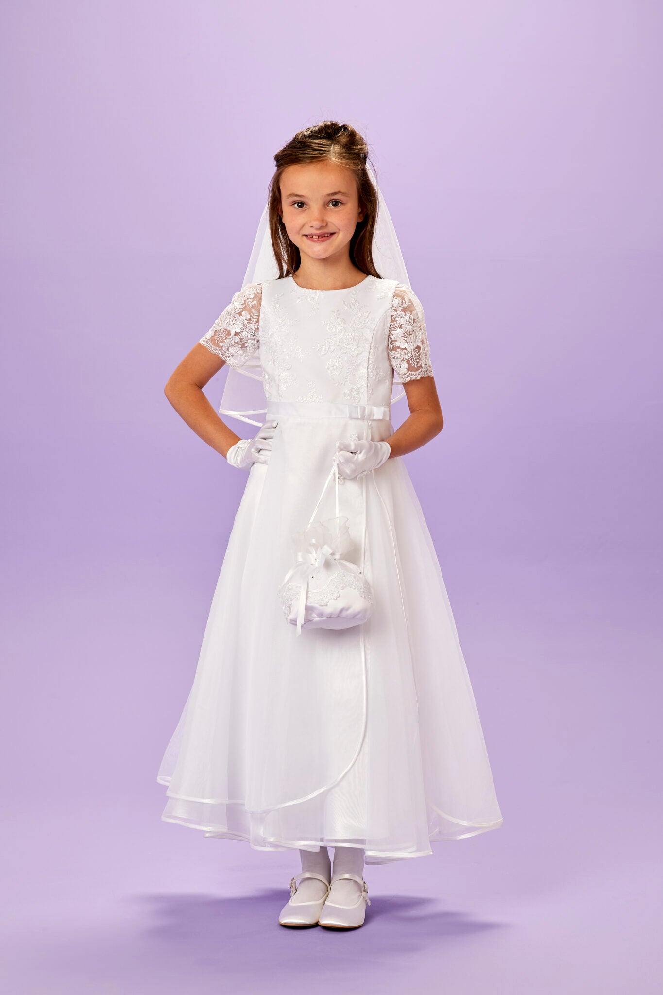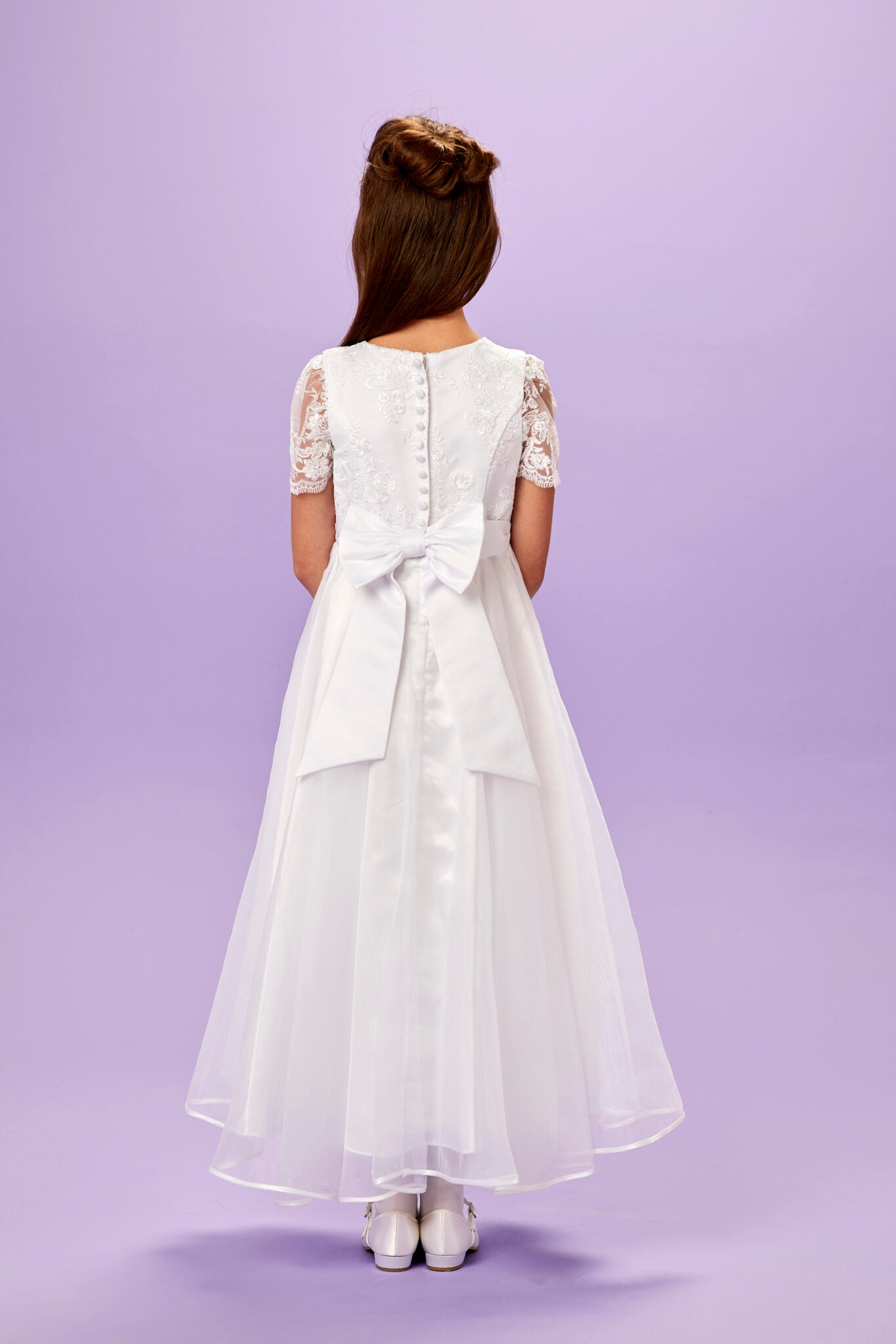 This stunning Izzy Holy Communion Dress is a stylish short sleeved ankle length First Holy Communion dress in white duchess satin which has a beautiful embroidered bodice and double bow at the waistband. The organza skirt has a delicate split front with a bound satin hem. The back has a large pre tied bow with luxurious long tails completing the look and maintains a perfect bow each time you wear this dress. The dress fastens at the back with an invisible zip hidden under a row of decorative buttons.