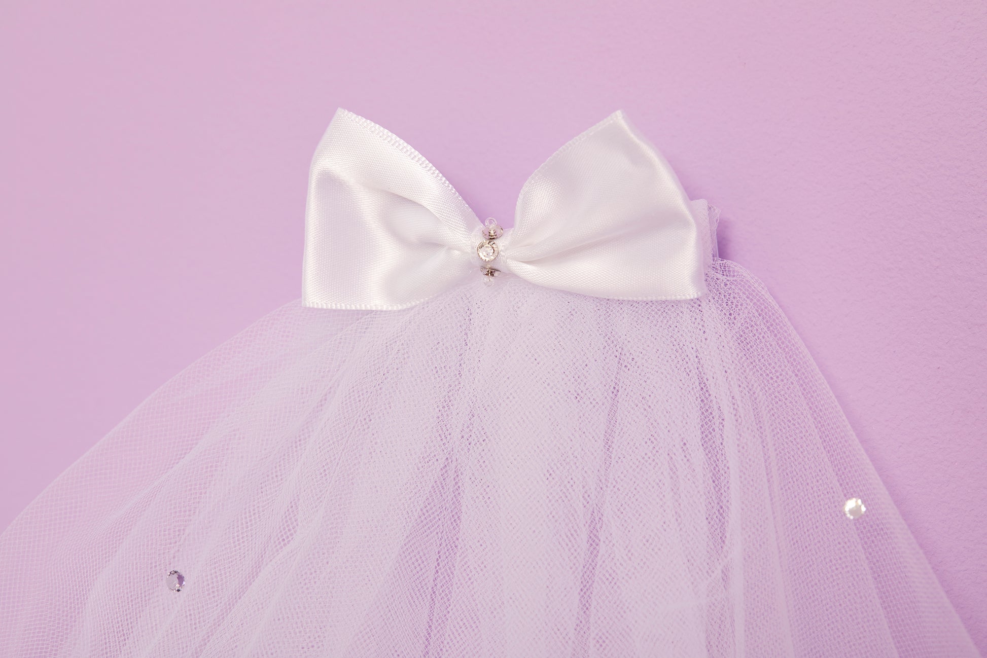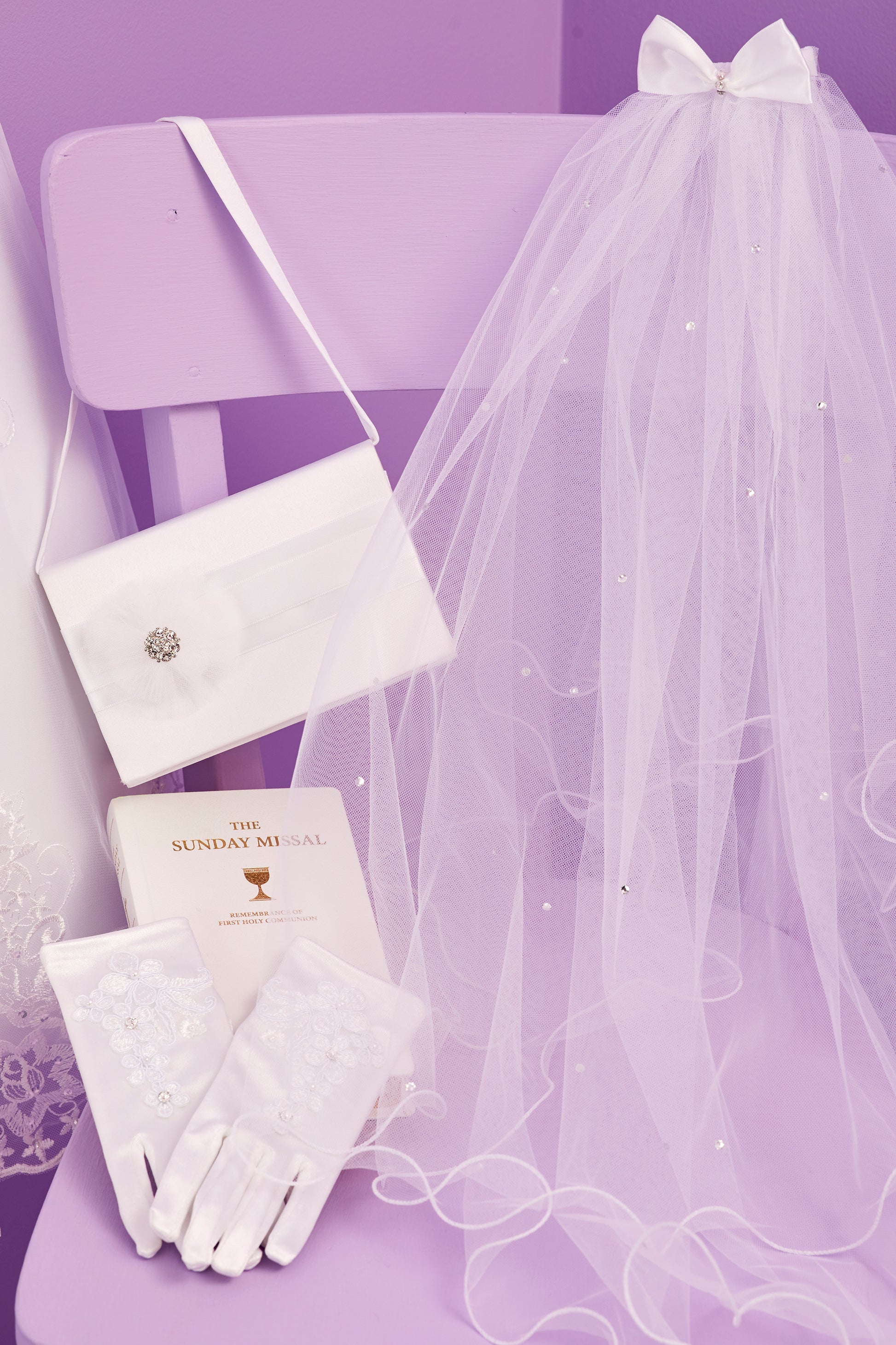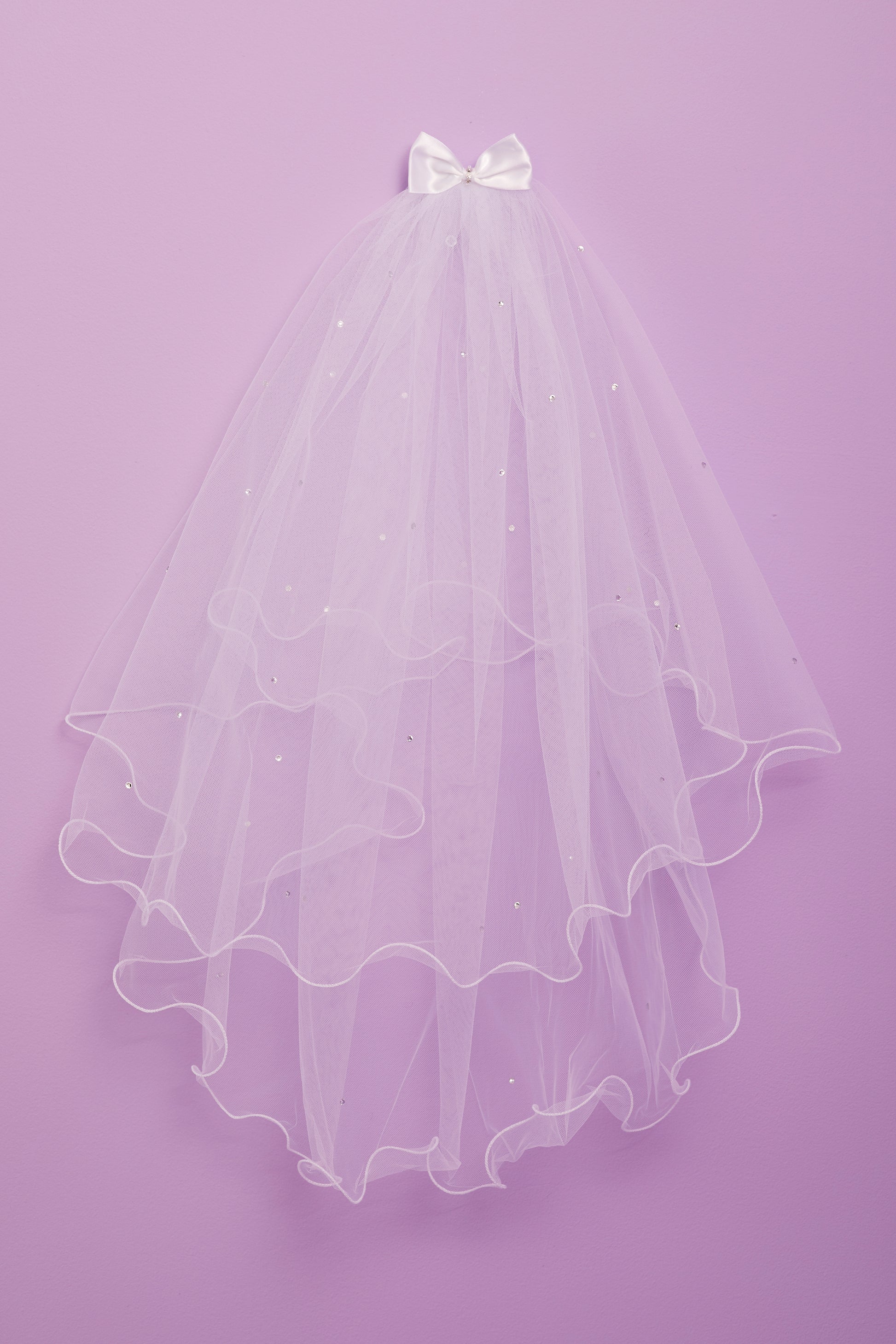 Classic white two-tiered communion veil. This elegant and classic white two-tiered communion veil comes with a scattering of diamante and a curly cram stitched hem. Featuring a net covered comb decorated with a diamante trimmed bow, it is ready to wear with or without a headpiece, offering the flexibility for many different hairstyles.
