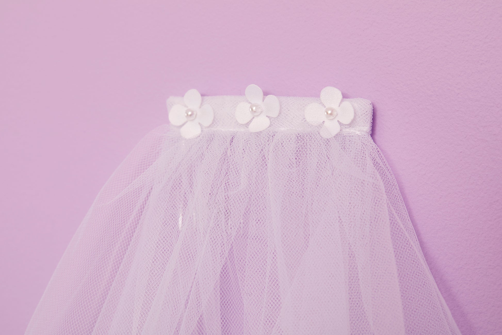 Nova is a classic white two-tiered communion veil. This elegant white two-tiered communion veil comes with a scattering of 3D flowers and pearls and a curly cram stitched hem. Featuring a net covered comb decorated with 3D flowers, it is ready to wear with or without a headpiece, offering the flexibility for many different hairstyles.