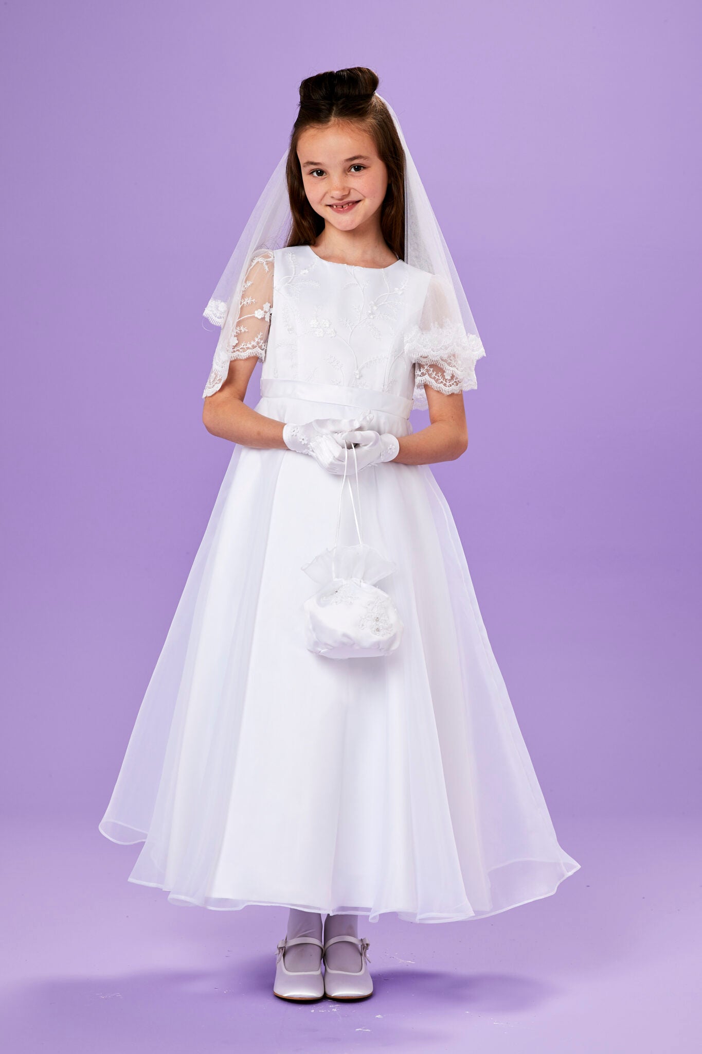 Our dresses are all made to the highest quality and are available in sizes 7,8,9,10 & 11 years. We also have a wide range of beautiful boleros to compliment this style. To complete the outfit further, we also have a selection of matching gloves, veils & bags to choose from.