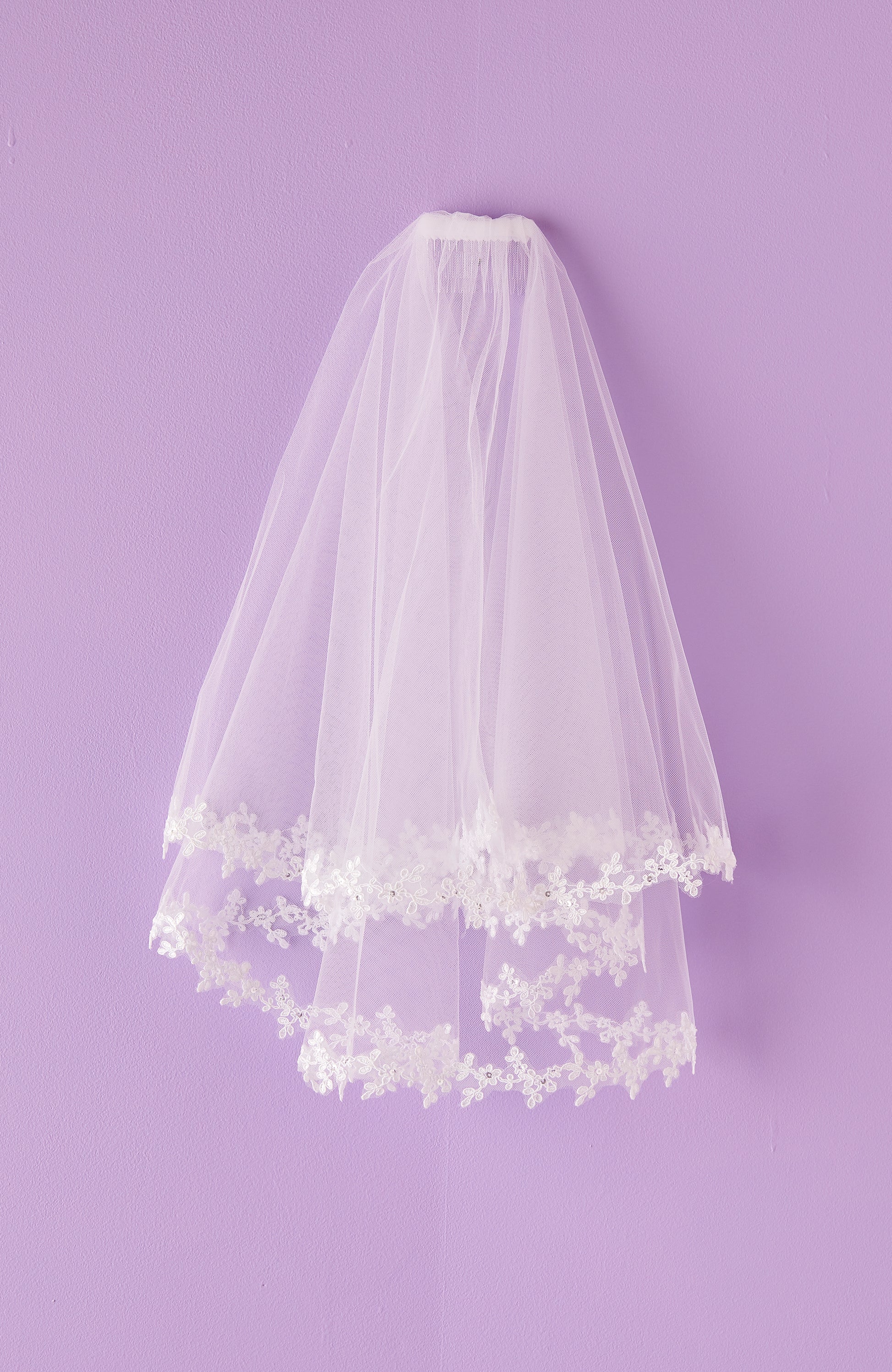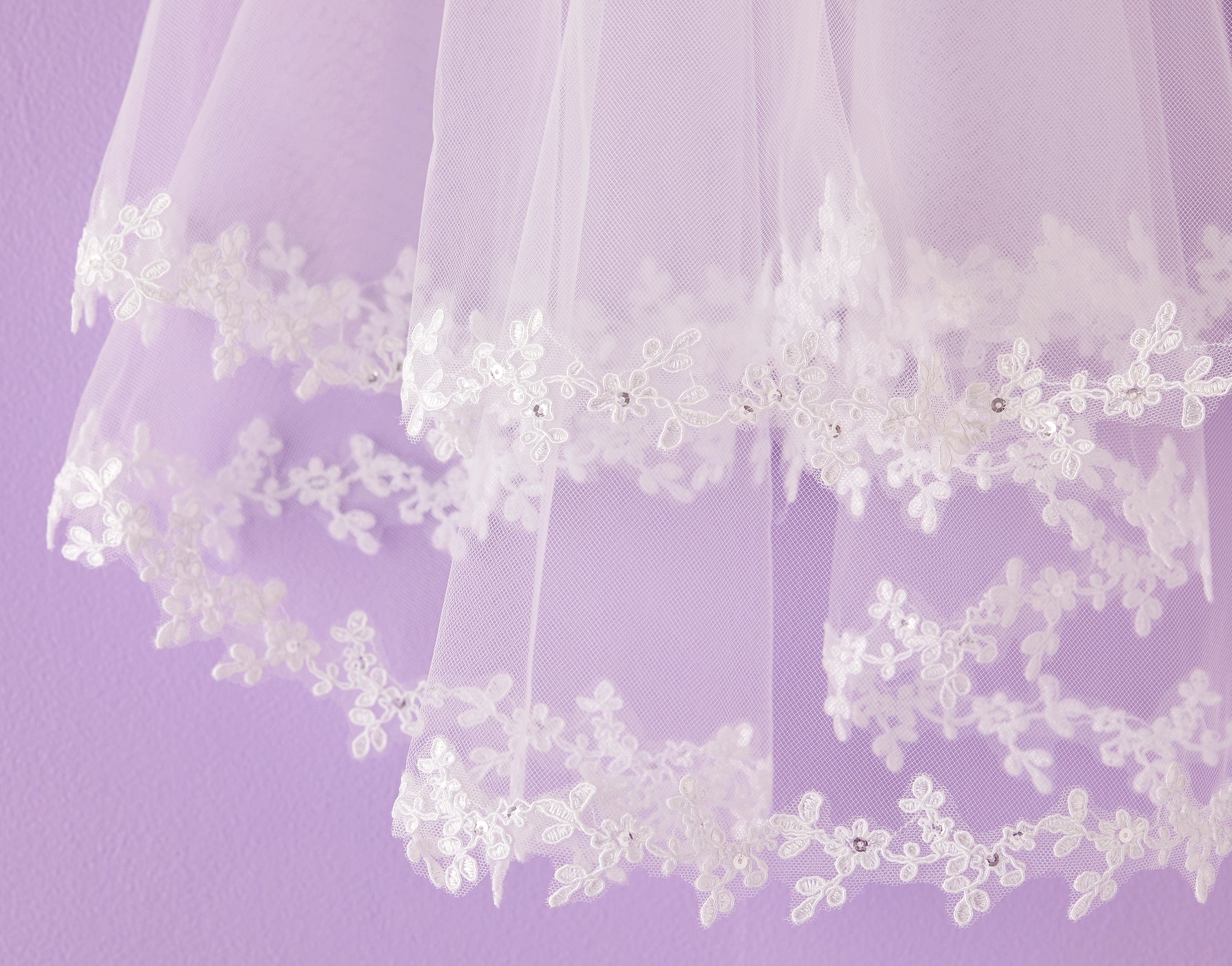 White two-tiered lace trim communion veil. This elegant and classic white two-tiered communion veil comes with a guipure lace trim hem decorated with sequins. Featuring a plain satin covered comb so it is ready to wear with or without a headpiece and offers the flexibility for many different hairstyles.